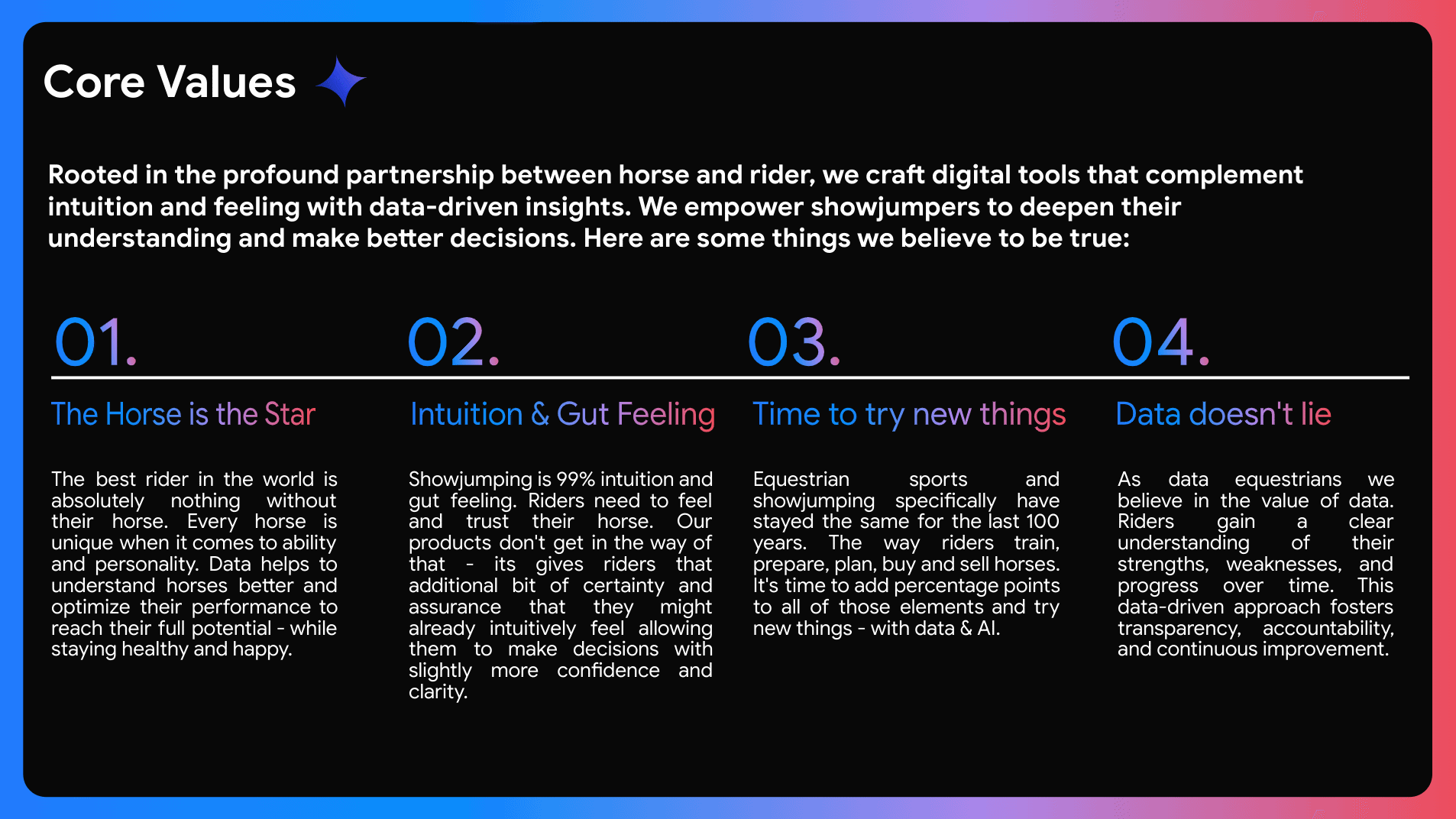 “ The goal is not to replace experience and gut feeling - its to support and gain an advantage over your competition. Buying a horse, planning your shows or tracking horse / rider progress - data should always be part of it ”